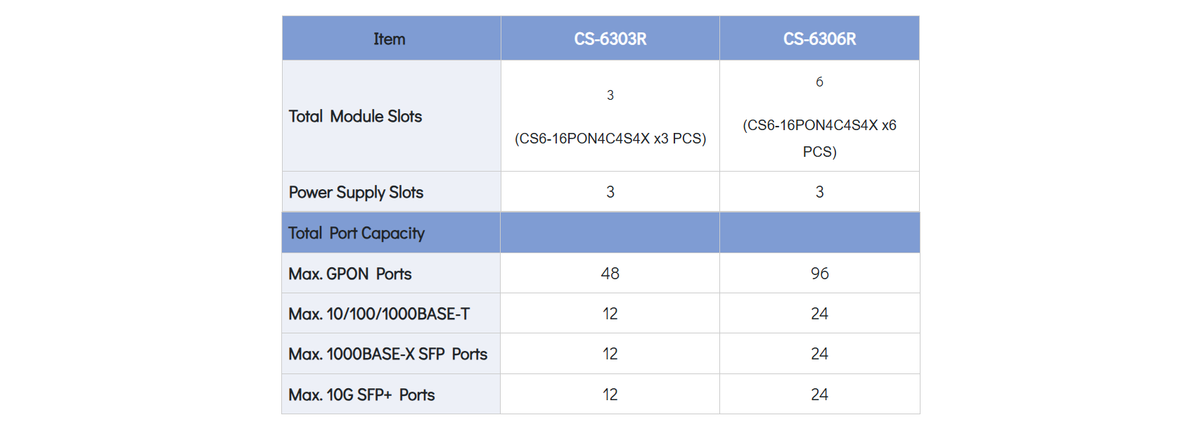 The CS-6300 series is a high-density chassis switch system equipped with 3 or 6 modular slots and redundant power supplies. By offering a variety of combinable management and switching modules, it provides exceptional deployment flexibility for network configurations. For example, the CS-6303R can support up to three CS6-16PON4C4S4X GPON modules, while the CS-6306R can accommodate up to six CS6-16PON4C4S4X GPON modules. Once fully equipped, the maximum number of functional ports is as follows: