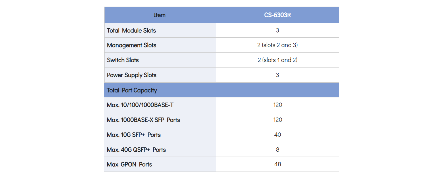 The CS-6303R is a high-density chassis switch built with three module slots and a redundant power supply. It provides great port flexibility for network deployment by offering various combinable management and switch modules. For instance, one management module can work with two switch modules, or two management modules can work together to perform system backup. The available modules for the CS-6303R chassis switch are listed below: